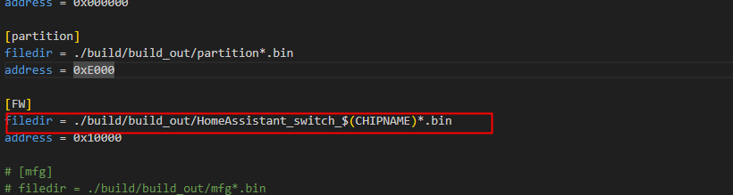 打开 “HomeAssistant_switch” 下的 “flash_prog_cfg.ini” 文件,把第 26 行“filedir = ./build/build_out/HomeAssistant_basic_$(CHIPNAME)*.bin”改成: