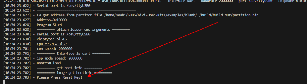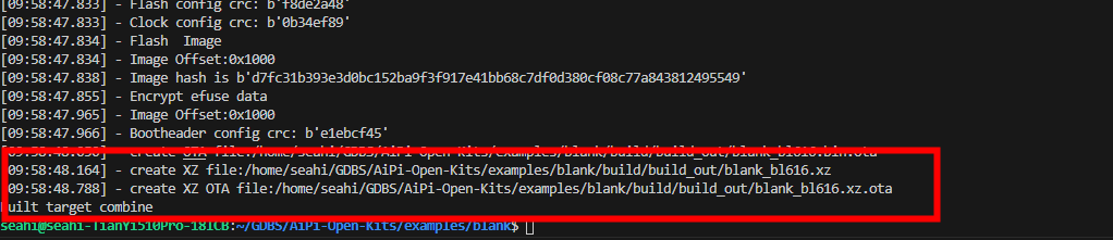 Built target combine./../../bl61x_SDK/os//tools/bflb_tools/bouffalo_flash_cube/BLFlashCommand-ubuntu --interface=uart --baudrate=2000000 --port=/dev/ttyUSB0 --chipname=bl616 --cpu_id= --config=flash_prog_cfg.ini[] - Serial port is /dev/ttyUSB0[] - ==================================================[] - [<font color="#ff0000"><b>Errno 2] No such file or directory: '/home/seahi/GDBS/AiPi-Open-Kits/examples/blank/../../bl61x_SDK/AiPi_bsp/board/bl616dk/config'</b></font>
