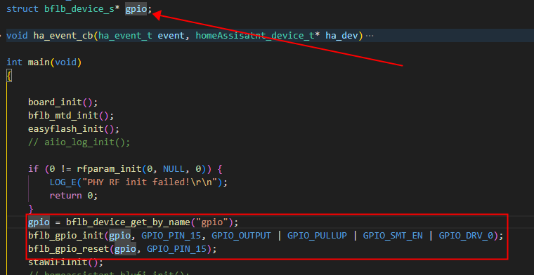 struct bflb_device_s* gpio;//全局变量gpio = bflb_device_get_by_name("gpio");bflb_gpio_init(gpio, GPIO_PIN_15, GPIO_OUTPUT | GPIO_PULLUP | GPIO_SMT_EN | GPIO_DRV_0);bflb_gpio_reset(gpio, GPIO_PIN_15);