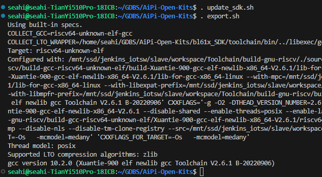 使用指令把小安派的配置同步到SDK内部,并设置编译工具,逐行运行以下指令(一定要全部执行成功):