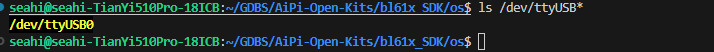 改成的原因是,当只有一个Ai-M61/M62开发板(或TTL工具)插入到ubuntu 中的时候,驱动中会显示 “/dev/ttyUSB0”,可以使用以下指令查看是否已经插入: