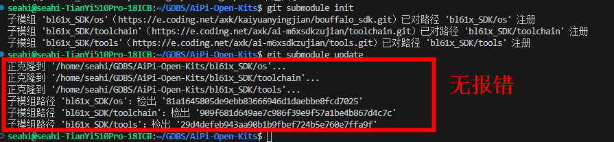 所以,在还需要到例程仓库里面拉取子模块,逐行运行以下指令(一定要全部执行成功):