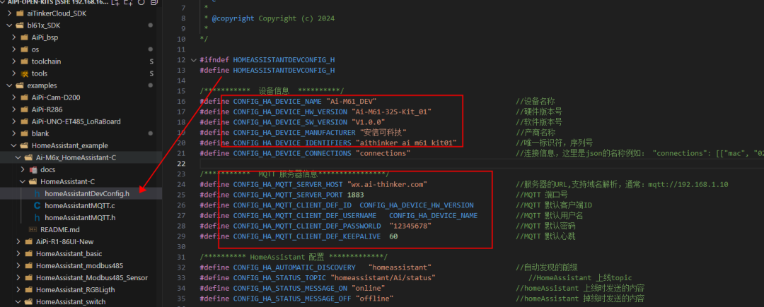 在例程当中,MQTT配置使用的是默认的MQTT参数,这些默认参数可以在 "Ai-M6x_HomeAssistant-C/HomeAssistant-C/"目录中的 “homeAssistantDevConfig.h”文件中找到: