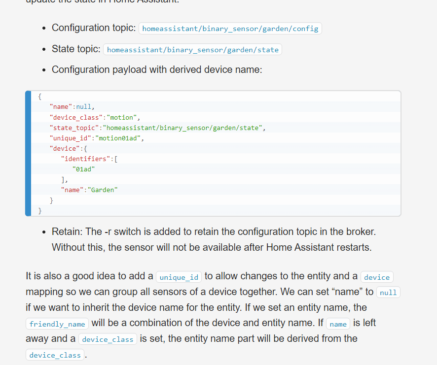 {"name":null,"device_class":"motion","state_topic":"homeassistant/binary_sensor/garden/state","unique_id":"motion01ad","device":{"identifiers":["01ad"],"name":"Garden"}}