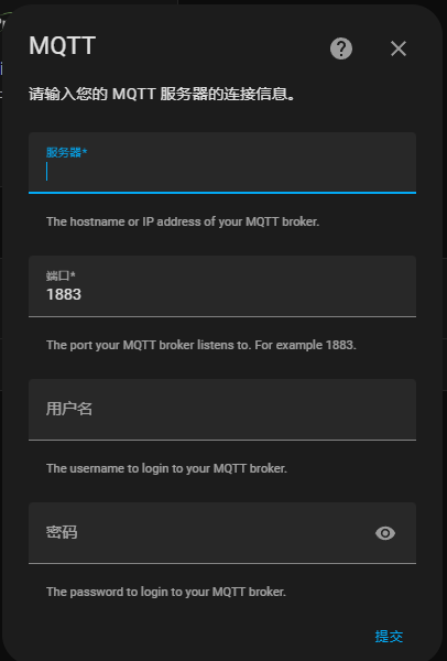 分别点击 “配置”——>"设备与服务"——>"添加集成"——>输入框搜“MQTT”,填入MQTT服务器的IP地址: