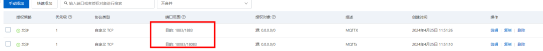 安装完成之后,远程服务器还需要开放两个端口:18083和1883.(18083 是MQTT后台管理端口,1883 是客户端连接端口,如果需要加密连接(SSL/TSL)的话,可能还需要开放8883)