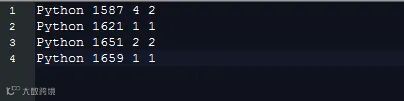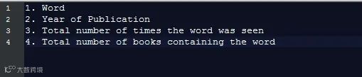差不多 170 秒(3 分钟)之后, one_grams 是一个 numpy 数组,里面包含差不多 14 亿行数据,看起来像这样(添加表头部为了说明):