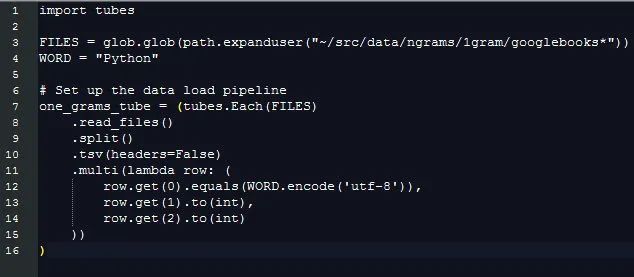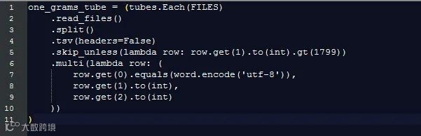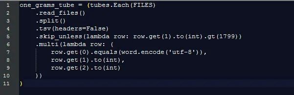 1-gram 的数据集在硬盘上可以展开成为 27 Gb 的数据,这在读入 python 时是一个很大的数据量级。Python可以轻易地一次性地处理千兆的数据,但是当数据是损坏的和已加工的,速度就会变慢而且内存效率也会变低。