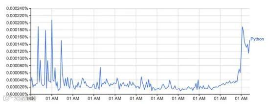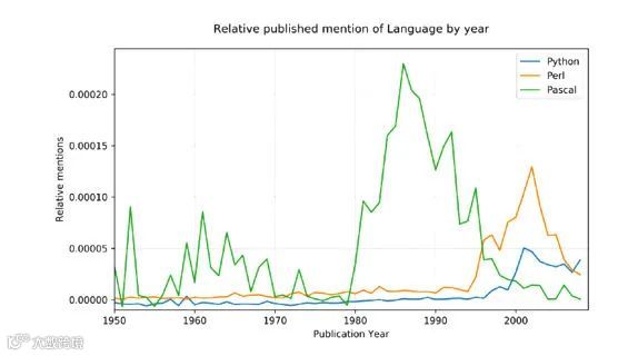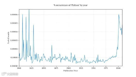 这幅图来自:books.google.com/ngrams… ,描绘了单词 ‘Python’ 的使用量随时间的变化。