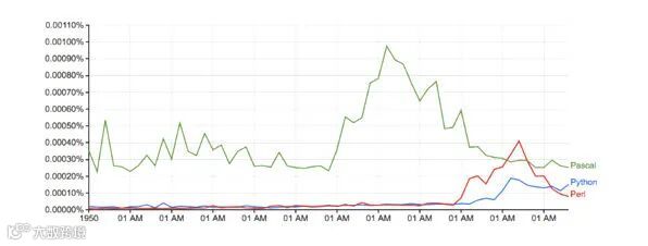 每一个语言的提及总数已经被转换到了从 1800 年到 1960 年的百分比平均数,考虑到 Pascal 在 1970 年第一次被提及,这应该有一个合理的基准线。