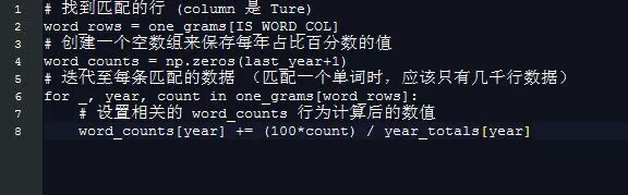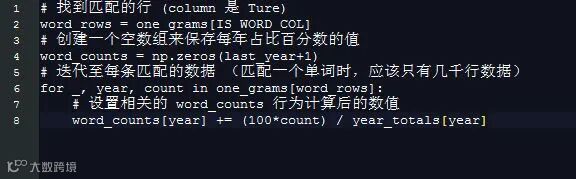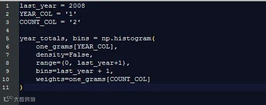 谷歌展示了每一个单词出现的百分比(某个单词在这一年出现的次数/所有单词在这一年出现的总数),这比仅仅计算原单词更有用。为了计算这个百分比,我们需要知道单词总量的数目是多少。