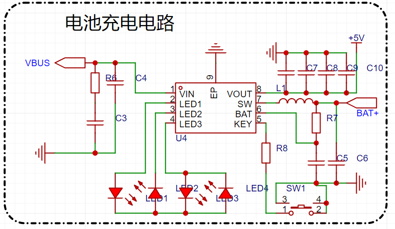 充电电路采用的 IC 是 IP3506,一款带电量显示,同步升压的芯片,能够完整实现充电宝应用的芯片。