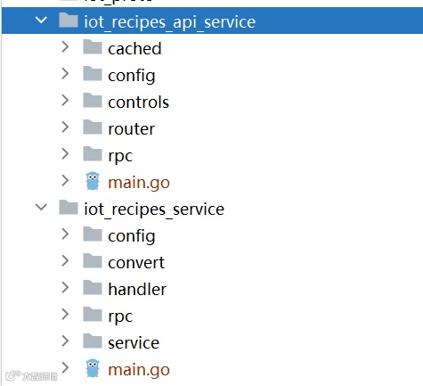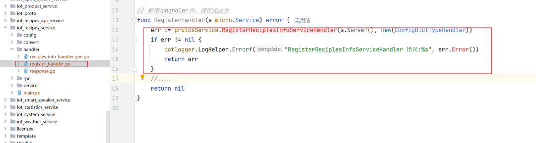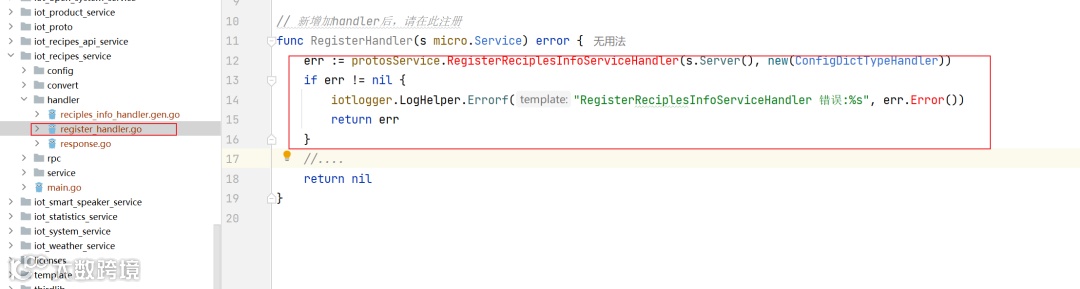 将生成所得的 convert、handler、service 目录直接复制到 iot_recipes_service 服务的根目录,注意 handler 目录有一个 handler 注册的方法需要手写,你需要打开手动编写下,将所有 handler 进行注册;