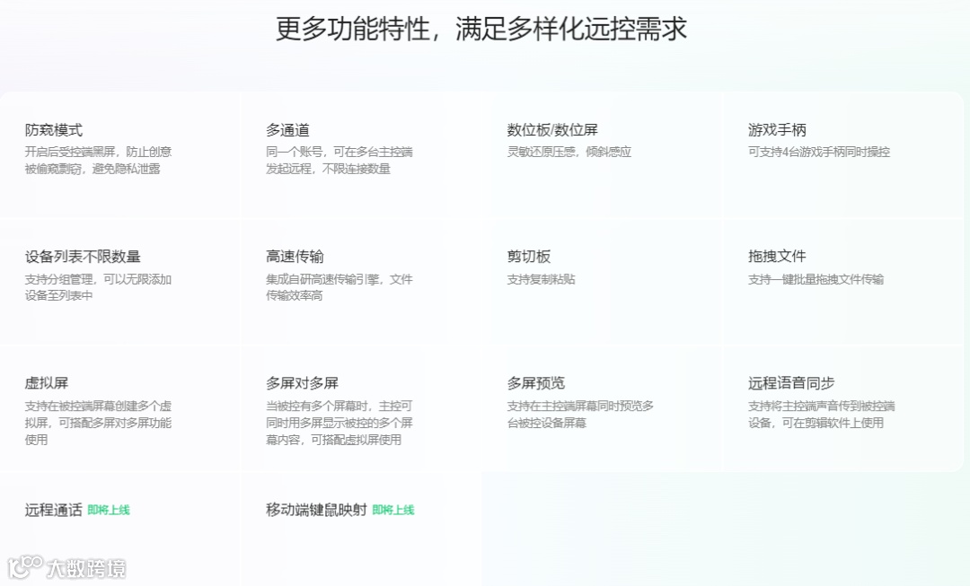 3、多功能的:它具有多种远程连接方式,并且还支持远程传输文件、远程关闭电脑、文本聊天等。