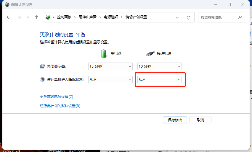 选择这一项【是计算机进入休眠状态】改成【从不】,如图所示: