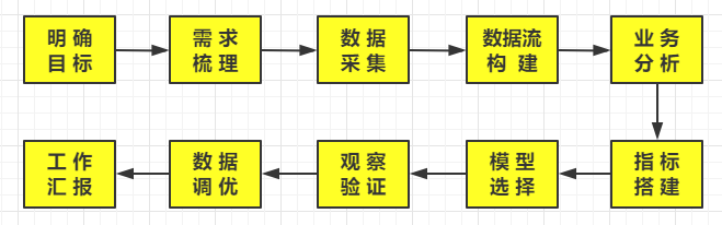 数据分析全流程:业务分析→数据可视化→数据洞察→决策分析→用数据讲故事。