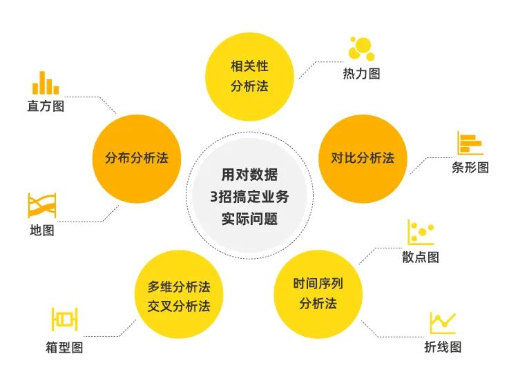 6大分析法:相关性分析法、分布分析法、对比分析法、多维分析法、交叉分析法、时间序列分析法。