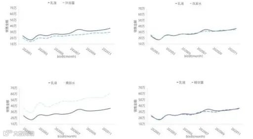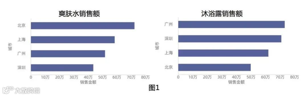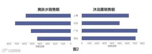 上图可以发现对于相同的数据,因为我们所需表达的主题的差异,也将呈现完全不同的展现方式。图1表达的主题是爽肤水和沐浴露两个品类在不同城市的销量排名,图2主要表达的主题是在相同城市在两个不同的品类的销量差异。