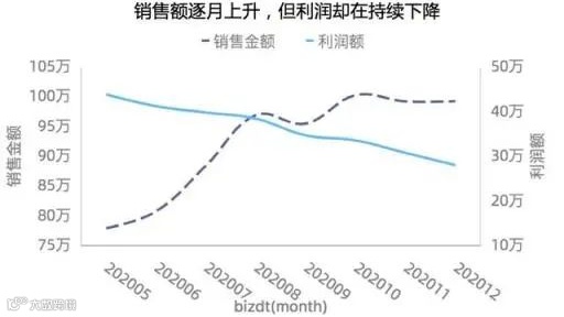对比可能不仅仅是一种对比关系,有可能是结合上文所说的成分、项目间、时间序列、频率分布、相关性对比中的一种或多种组合而成,我们称之为“多重对比”。例如“销售额在过去10年内稳步增长,但利润却没有同步增长”,这案例第一部分“销售额在过去10年内稳步增长”属于“时间序列对比”,第二部分“但利润却没有同步增长”属于项目间对比。对于这种情况,我们需要确定哪一种关系是主要的,哪一种是次要的。案例中,第一部分随时间变化是主要的,而销售额与利润项目间对比是次要的,因此最好选择以时间变化对比的折线图,并为每一个项目画一条支线的方式实现,如下图: