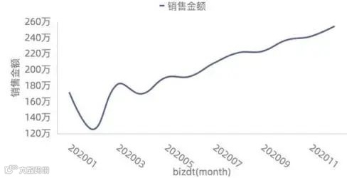 如下图,这张图到底是为了表达全量销售金额没有明显的增长呢?还是为了表达2月份销售金额断崖式下跌?还是为了表达其它什么主题呢。请在标题上明确的告诉听众。