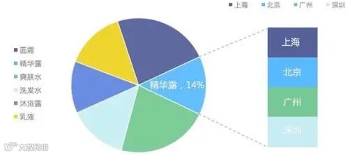 成分对比主要体现在对与一个整体的每个部分的百分比的对比。常常出现“份额”、“百分比”等词汇。成分对比通常使用饼图来展现: