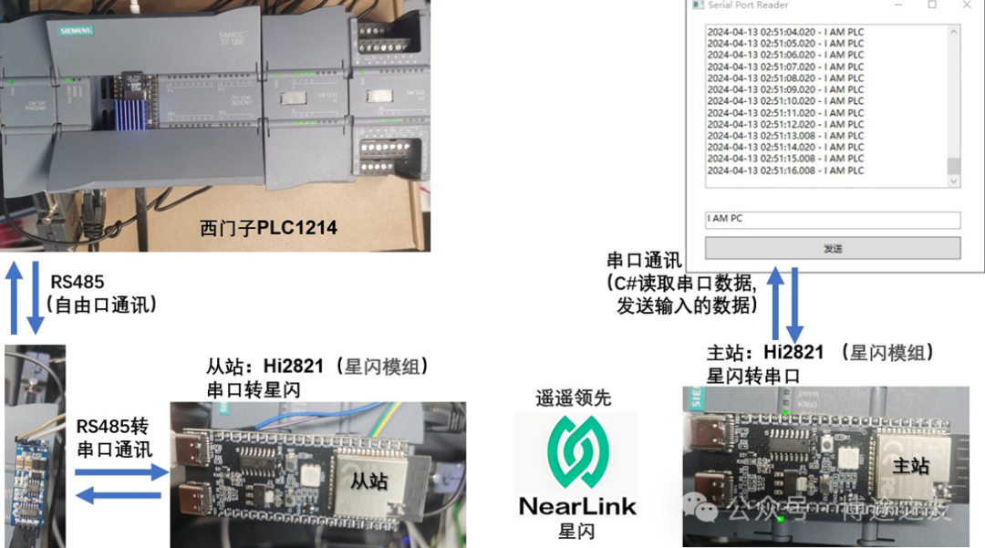 西门子PLC1214利用CM1241模块(支持RS485/422通信)发送'I AM PLC'数据,随即这些数据通过MAX485芯片模组从RS485信号转换为TTL信号。转换后的TTL信号被传递至从站Hi2821模块,并通过星闪技术与主站Hi2821建立连接。一旦连接建立,主站Hi2821通过串口与电脑相连,电脑上运行的WPF(C#程序)负责读取串口信息并在用户界面进行展示。同时,该程序也可以发送'I AM PC'数据回传至PLC,实现双向通信。这个整合流程不仅体现了星闪技术在工业自动化中的关键作用,而且还显示了它在尚未完全公开SDK的情况下如何支持数据的可靠传输和实时显示。