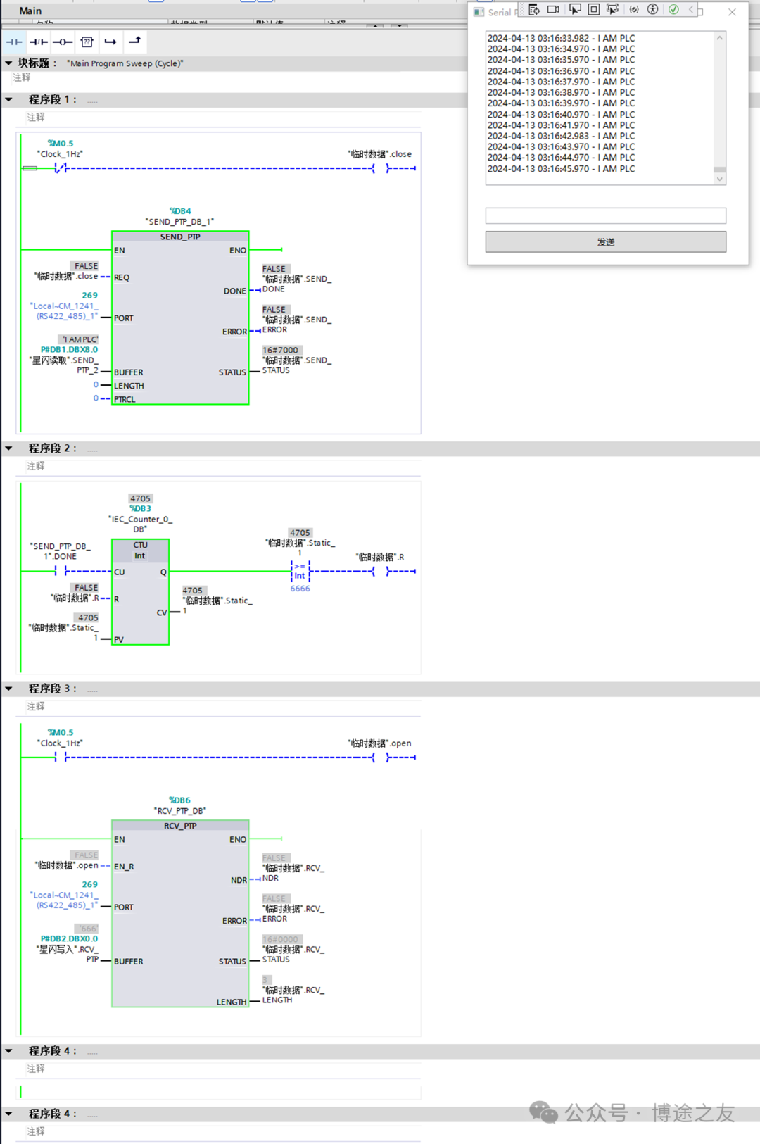 在编写PLC程序时,我们使用了简单直观的梯形图(LAD)编程语言,并特别使用了SEND_PTP与RCV_PTP这两种通讯指令。整体程序如下: