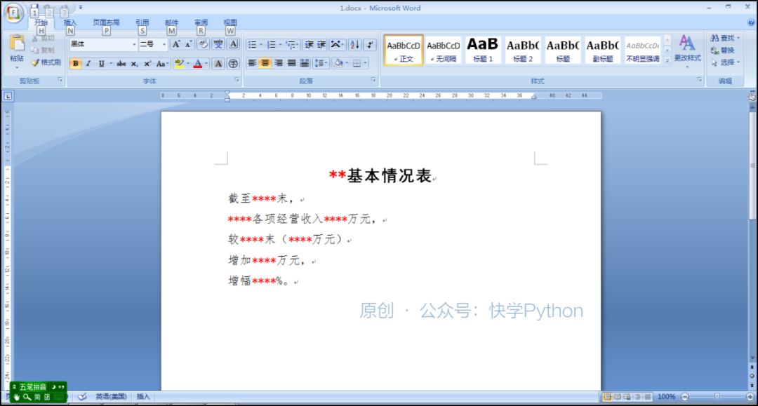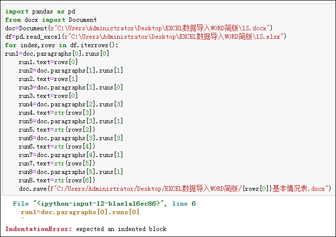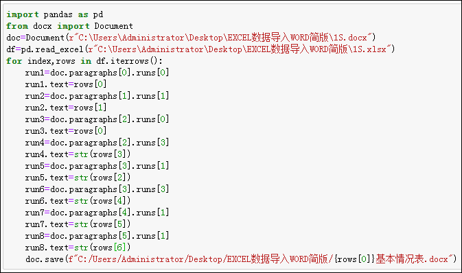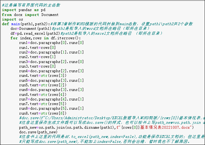(与书本代码不同点有以下:一是主函数main有path1、path2共2个参数;二是保存文件名写为"{rows[0]}基本情况表20221007.docx",可参考P24“1.5.3 字符串格式化的3种方式”;三是WORD文档保存的最后一句代码应写为doc.save(path_new)”,不能画蛇添足地照抄书本代码加上index=False否则又会出错)