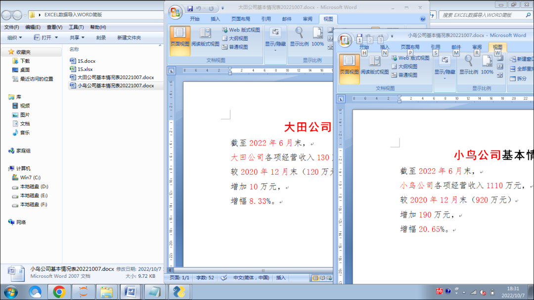 运行代码1后,新形成2个WORD文件,就是我们所需要的“移植”后的文档,而且数据与“仓库”的一致。