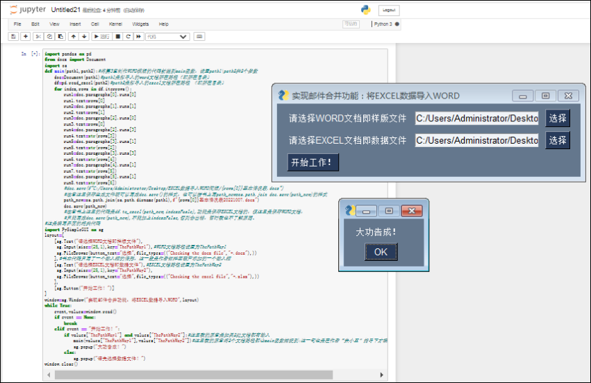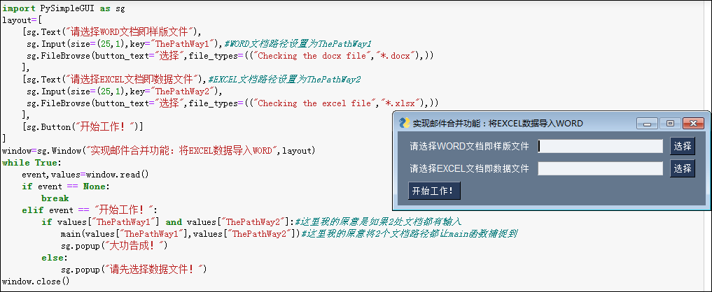 所以笔者本着编写程序窗口界面的目的,又学习了第十二章“Python图形界面开发” (P366)部分,并参照编写了一个自定义函数,将上述代码“封装”起来,原代码详见附件代码2之1。注意:本书P366样例的主函数中只有1个参数,但笔者写的主函数需要2个参数(导入WORD文档、EXCEL文档共2个文件),所以写的时候还是有点不踏实的,好在运行时没有差错(注:这时的运行代码只能检查代码有无基本错误问题,因为未导入文档,无法看到结果)。