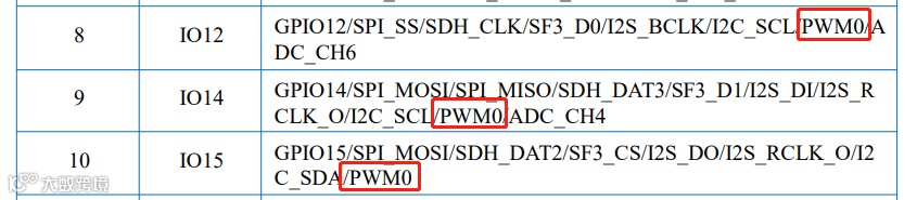 在M61芯片的模组规格书中可以看到这三个IO口都支持PWM0
