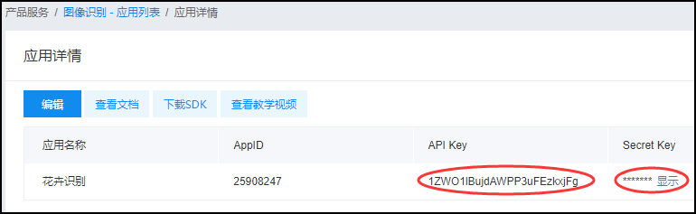 我们按照步骤创建新应用,并得到专属自己的API Key和Secret Key,具体如下图所示。