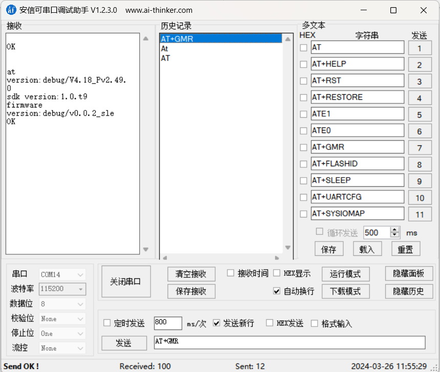注意输入AT指令需要勾选发送新行(加回车换行)