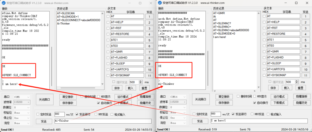 连接成功后,主机从机会出现SLE_CONNECT字样,此时会自动进入透传模式,主机从机可以通过串口发送数据到对方。