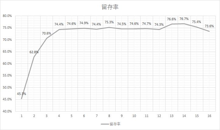 样本中,新客户消费1次后有45.3%的客户留存下来继续消费,到了第3次消费后的留存客户占70.6%,第4次消费后的留存率基本上处于75%的平衡线附近。