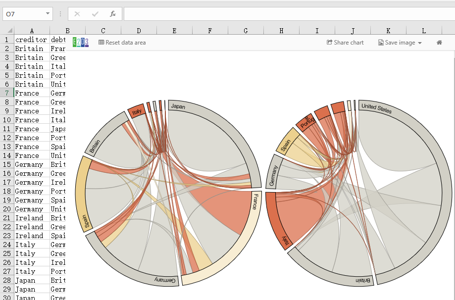 下面这幅图就是D3的一幅原图——欧元债务危机,这里通过插件轻松复现。
