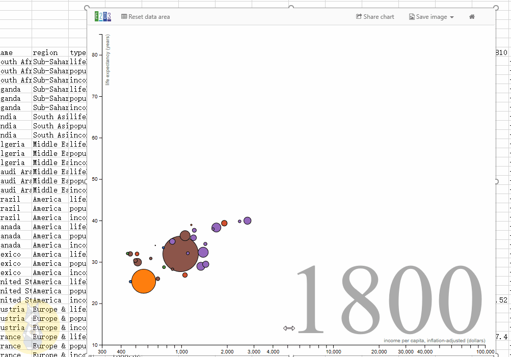 带有大小、颜色、时间滑块等属性的动态气泡图,主要用于表示随时间变化的趋势。