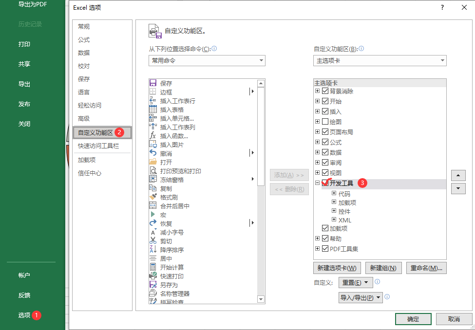 依次选择:【文件】👉【选项】👉【自定义功能区】,在【开发工具】前打勾并确定,具体操作见下图。
