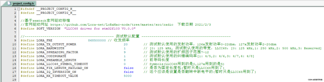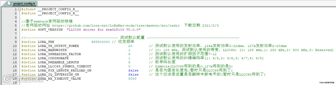 1、在文档 “project_config.h” 中设置各个射频参数,无论启用发送模式还是接收模式,这些参数均一致;