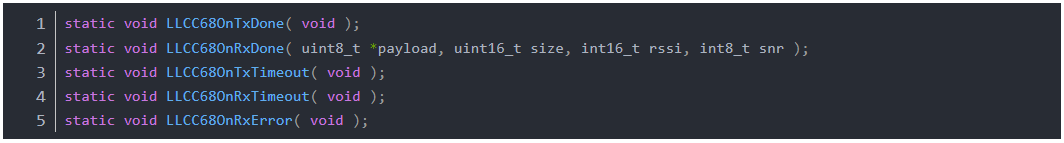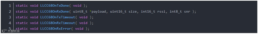 ◆发射超时中断 “LLCC68OnTxTimeout” ,该回调函数主要用于处理数据发送超时后的逻辑内容;