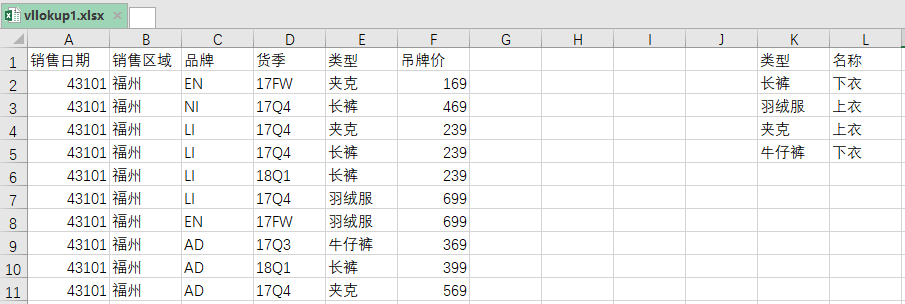如图所示,有一个“vlookup.xlsx”文件,“A1:F11”是我们的数据源区域,“K1:L5”是我们的查找源区域。我们的目的就是要在数据源区域的G列加一列数据,查找出不同类型下名称表示。