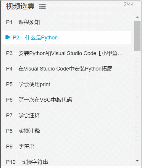 该课程一共有 44 个视频,目前播放量已经有240多万,在B站上的播放量也有15.6万,点赞量2.9万,如果你想从零开始学习Python,就从这份视频开始吧。