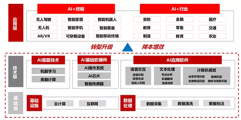 AI经过近几年的发展,已经成为了一个完整的生态链。从基础层到技术层,再到应用层,分工明确,技术对应细分领域,不同岗位匹配不同人才。