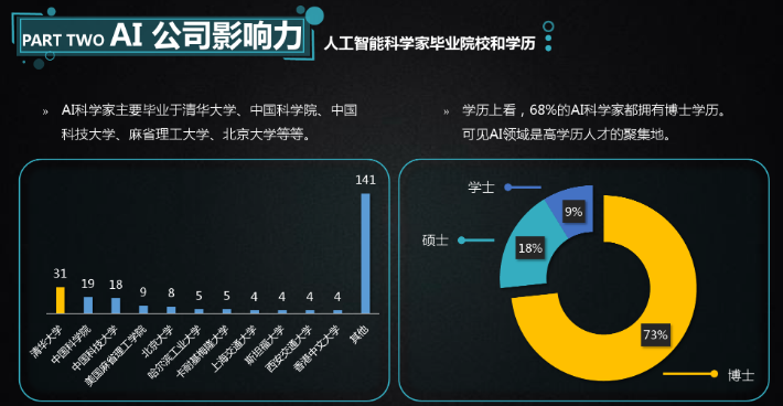 人工智能科学家主要毕业于清华大学、中国科学院、中国科技大学、麻省理工大学、北京大学等知名学校,学历上看,73%的人工智能科学家都拥有博士学历,可见人工智能领域是高端人士的聚集地,普通人根本玩不了,你有没有瑟瑟发抖呢?