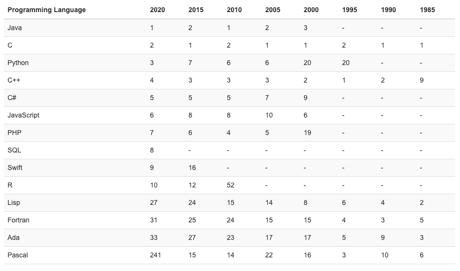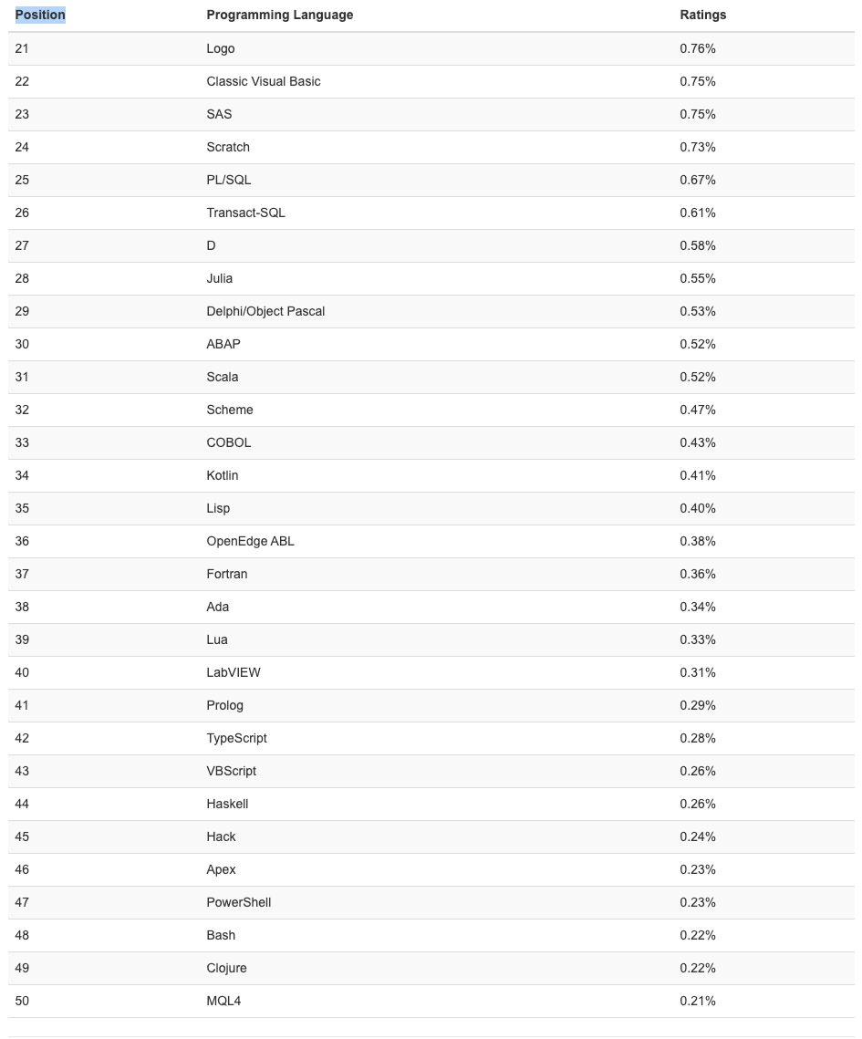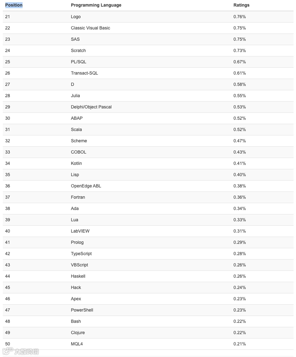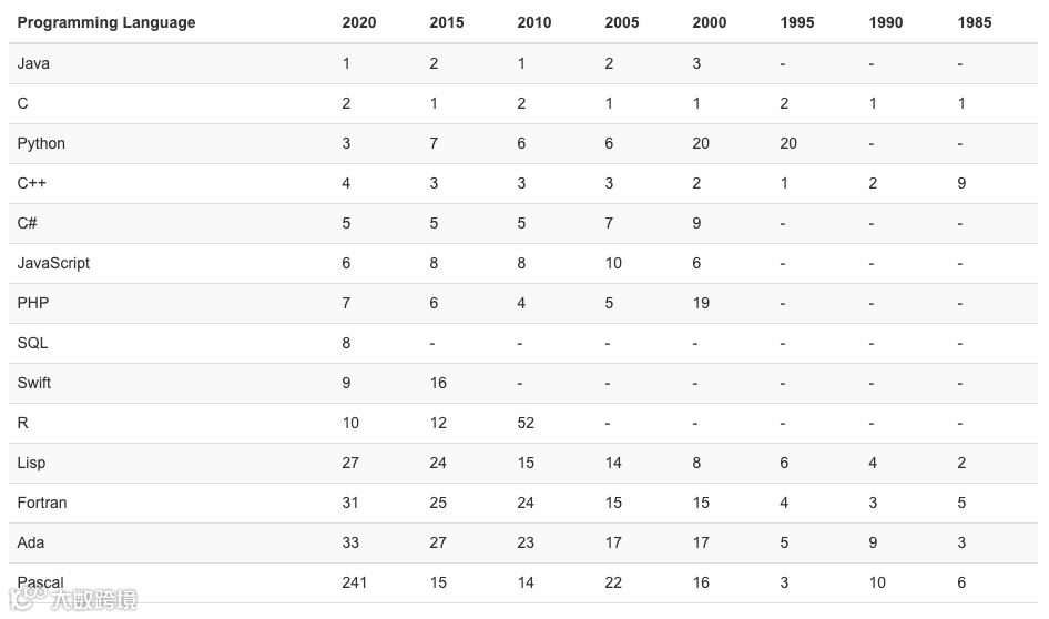 TIOBE 每个月都会公布一次编程语言的排行榜,这份排行榜排名基于全球技术工程师、课程和第三方供应商的数量。