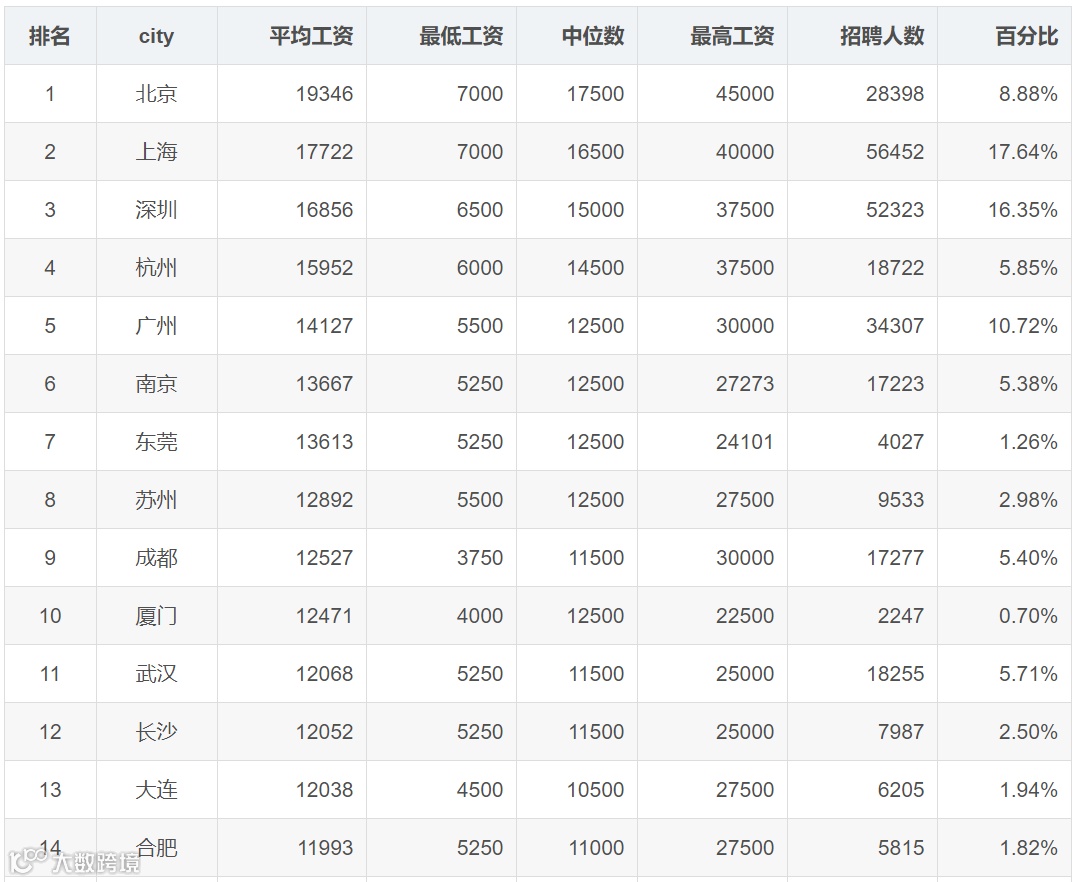 2020年9月深圳招收Java程序员18181人。2019年9月深圳Java程序员平均工资17313元,工资中位数16000元,其中95%的人的工资介于7000元到37500元。