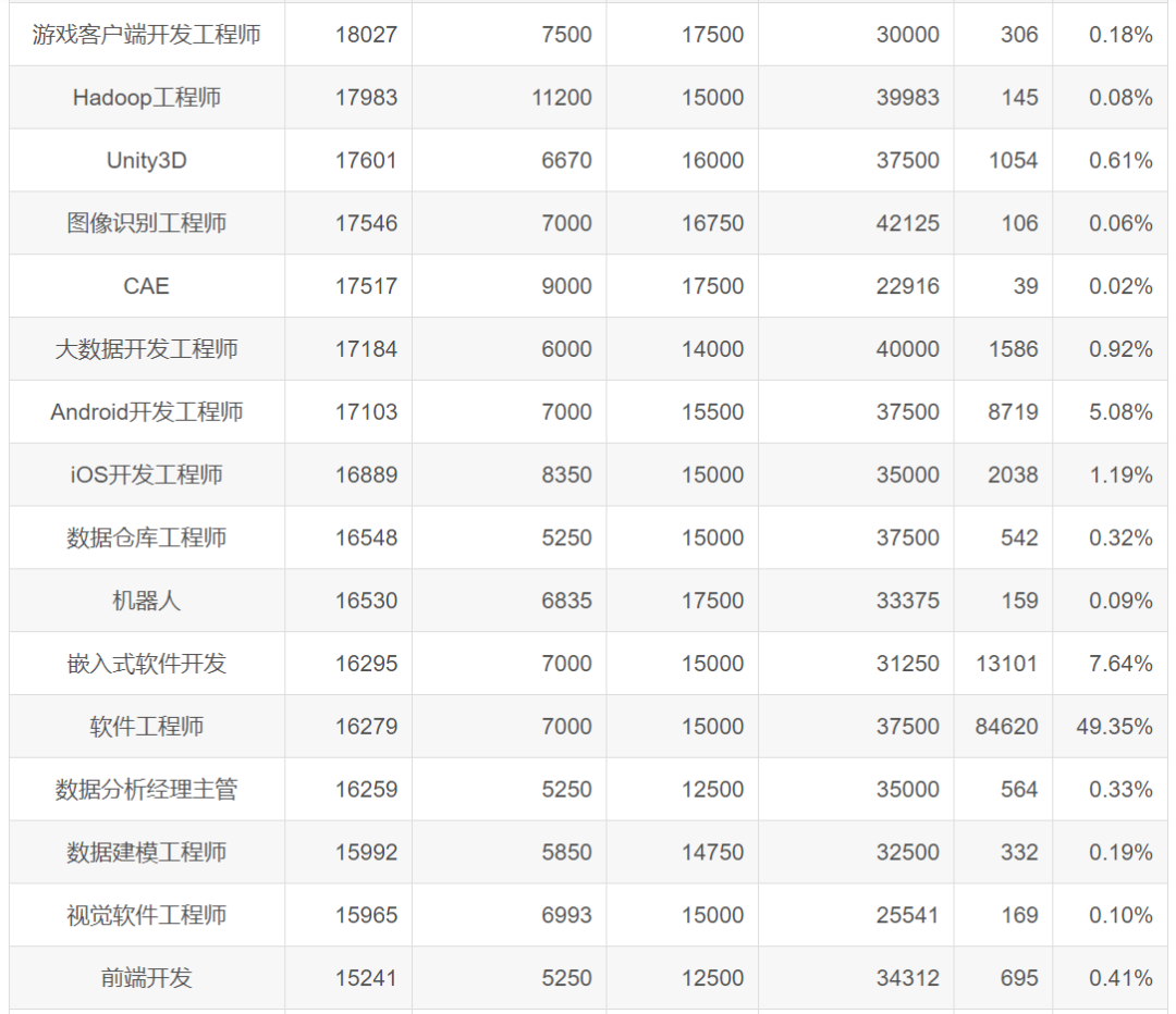 2020年9月北京招收Java程序员11930人。2019年9月北京Java程序员平均工资18996元,工资中位数16500元,其中95%的人的工资介于7000元到45000元。