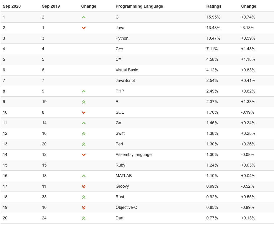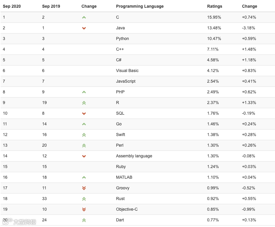 9 月份编程语言排名前十的分别是:C,Java,Python,C++,C#,Visual Basic, JavaScript ,PHP ,R,SQL。