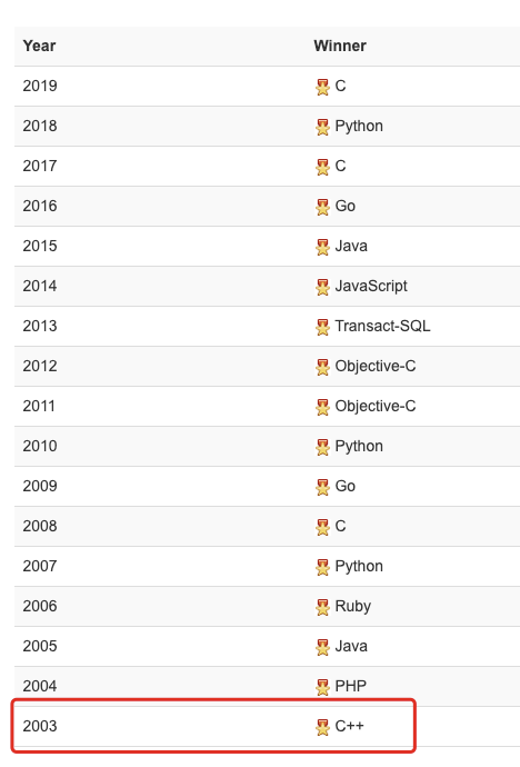 C++ 曾在 2003 年获得年度编程语言的称号,排行榜中比例高达 17.53%,达到历史最高峰。