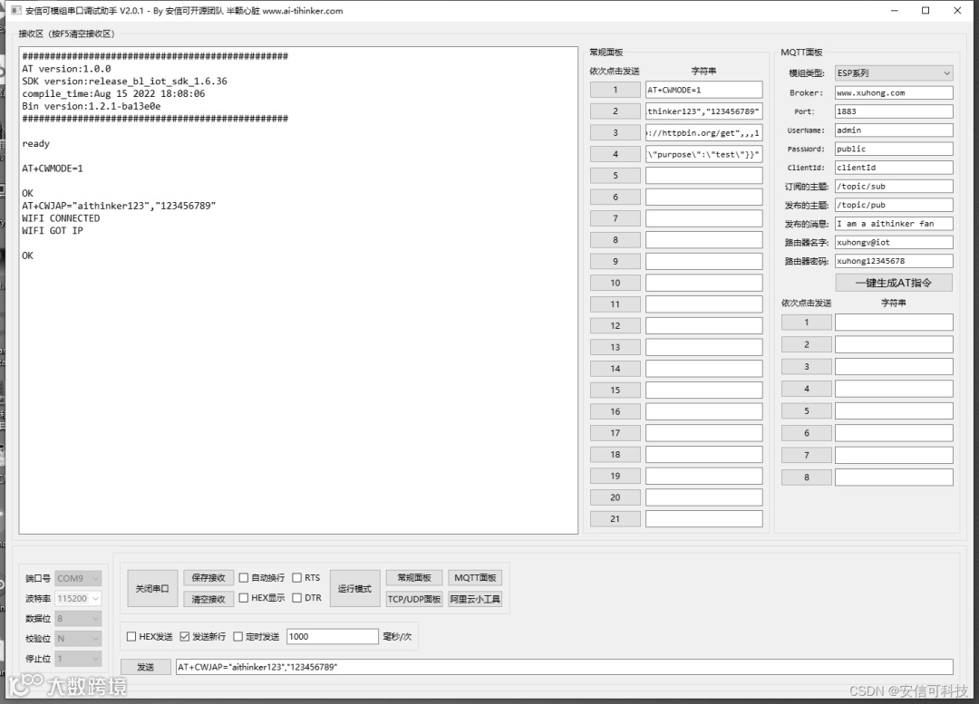 发送AT+CWMODE=1;AT+CWJAP=“WIFI名称”,“WIFI密码”,比如我现在测试的WIFI名称为aithinker123,密码为123456789,如下图: